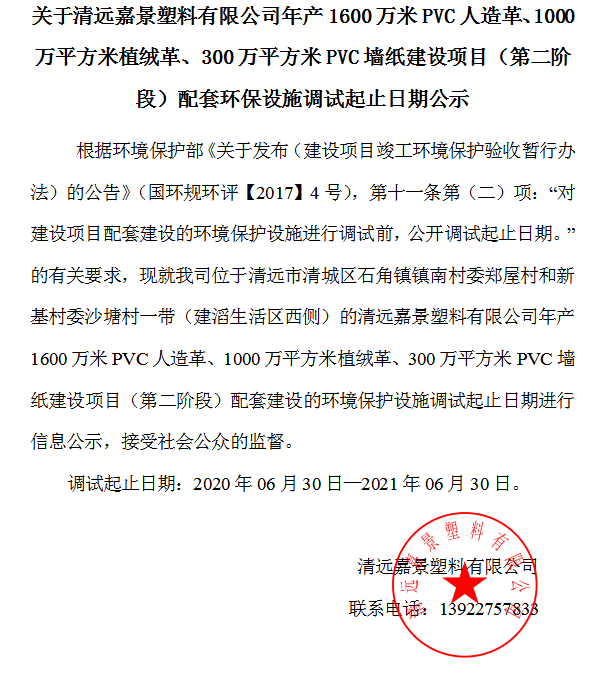 下一页: 关于清远嘉景塑料有限公司年产1600万米PVC人造革、1000万平方米植绒革、300万平...