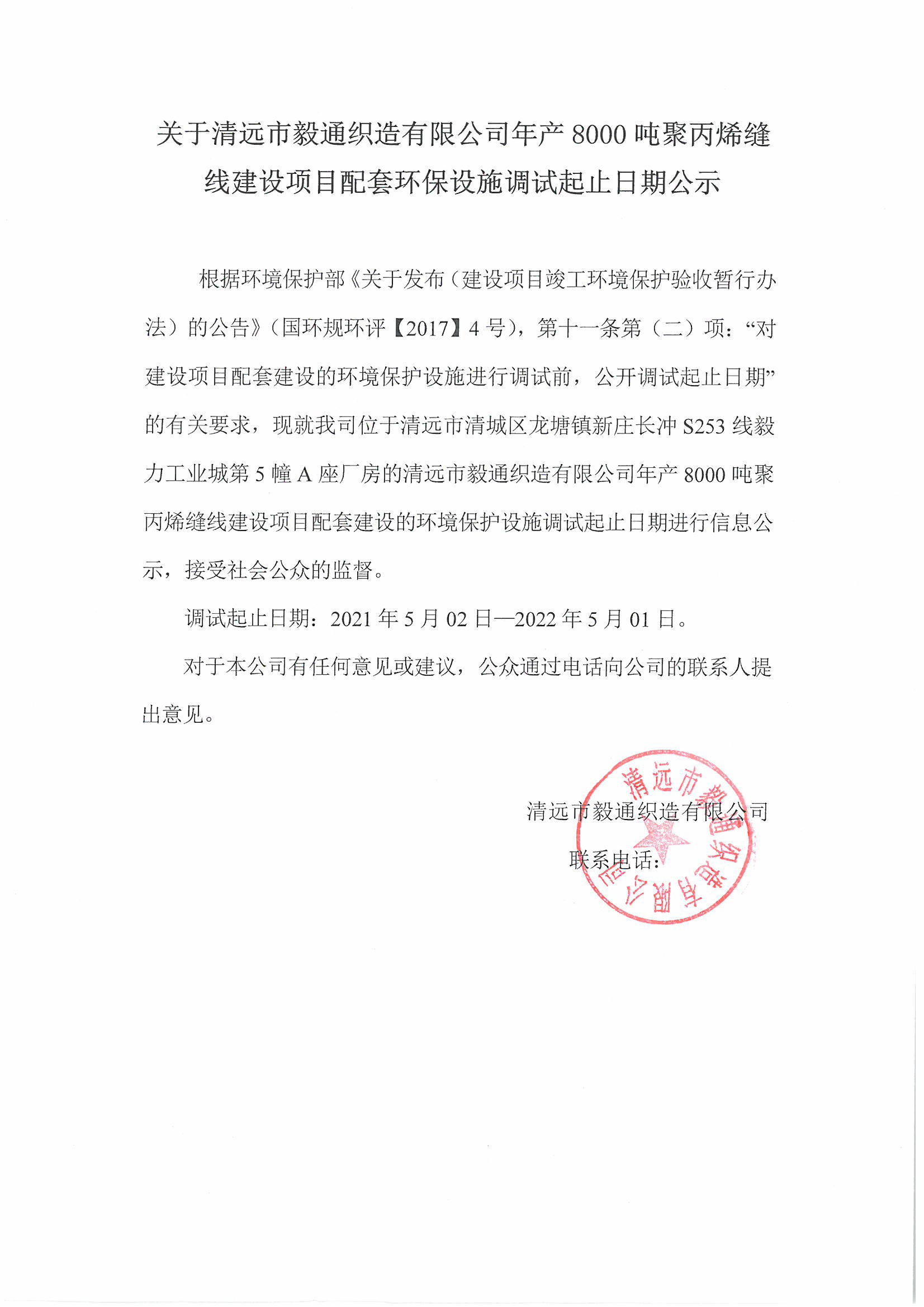 下一页: 关于清远市毅通织造有限公司年产8000吨聚丙烯缝线建设项目配套环保设施竣工...