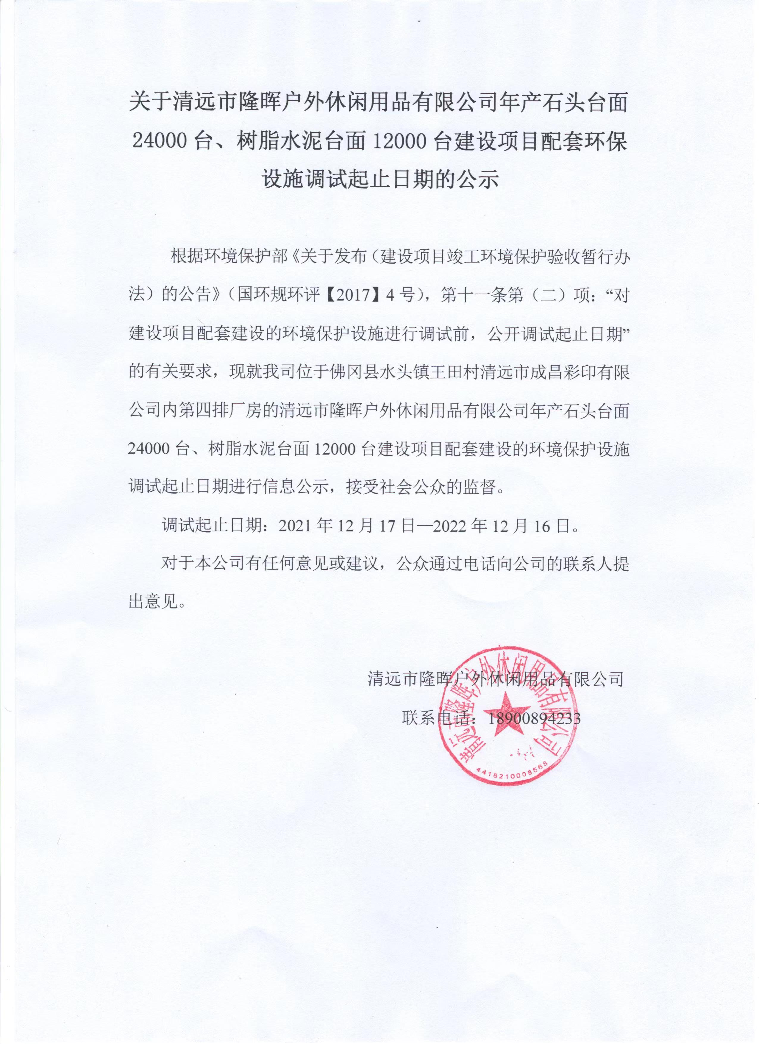 下一页: 关于清远市隆晖户外休闲用品有限公司年产石头台面24000台、树脂水泥台面120...