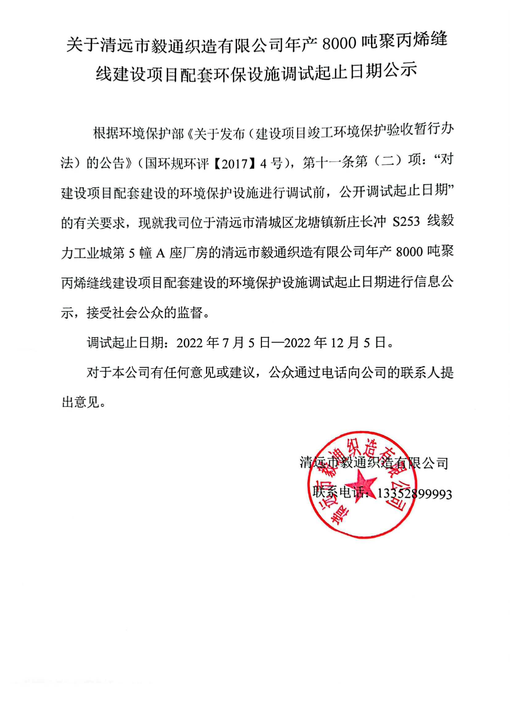 下一页: 关于清远市毅通织造有限公司年产8000吨聚丙烯缝线建设项目配套环保设施竣工...